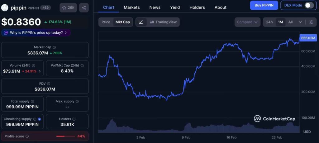 Currently boasting a market cap of around $836 million, Pippin (PIPPIN) is up more than 170% over the past month and shows a lot of potential to explode even further in the following months. However, its outlook is that of a meme coin, reflecting a fragile balance between strong momentum and significant structural risks.