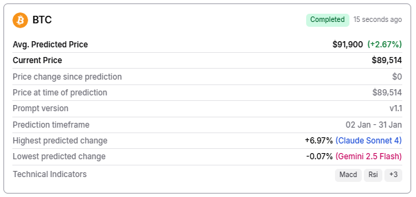 The average Bitcoin price target for the end of January came out at $91,900, implying a 2.67% upside from current levels. Claude Sonnet 4 gave the most bullish figure, projecting a potential 6.97% rally, while Gemini 2.5 Flash actually suggested the price could go down 0.07% downside. ChatGPT was bullish but conservative, arguing for a 1.1% gain.