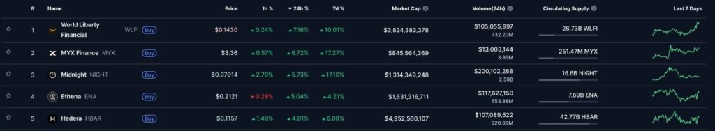 Hedera 24-hour chart gains among top 100 crypto assets. Source: CoinMarketCap