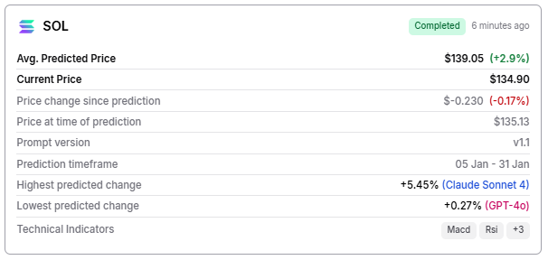 On average, the three models estimated Solana would reach $139.05 by the end of January, suggesting a 2.9% rise from where it currently trades. Claude Sonnet 4 provided the most bullish scenario, with a possible 5.45% advance, whereas Gemini 2.5 Flash and ChatGPT called for a 3.15% and 0.27% gain, respectively.