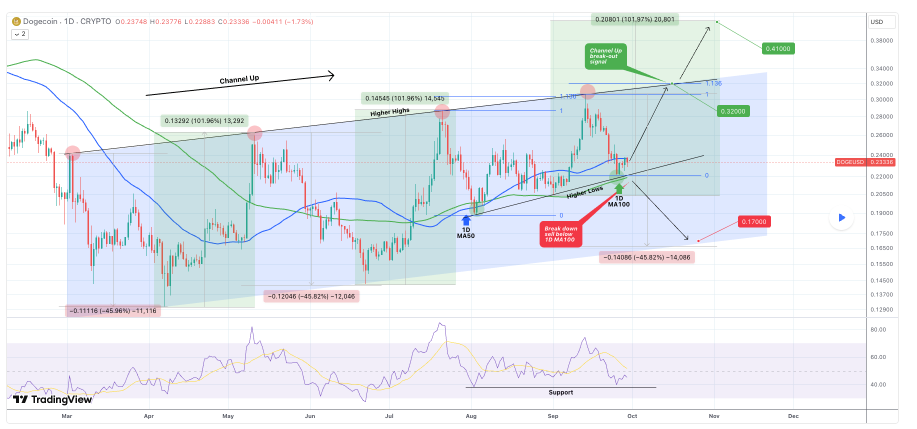 If Dogecoin closes a daily candle above the channel’s upper boundary, it could surge over 100% to $0.41.