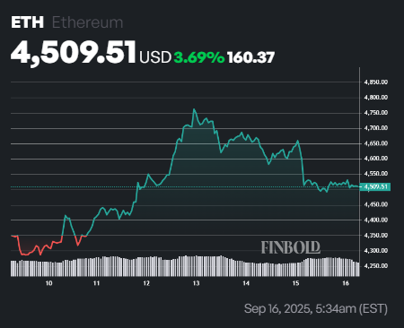 The forecast comes as Ethereum recently hit a record high near $5,000 before pulling back in line with broader markets. As of press time, ETH was trading at $4,507, down less than 0.5% on the day but up 3.6% over the past week.