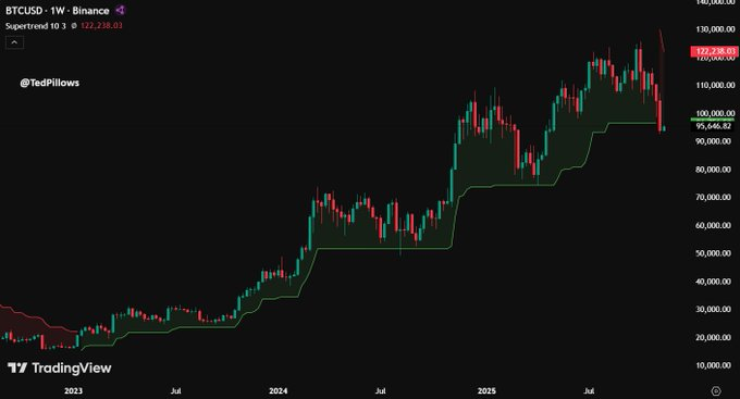 To this end, crypto analyst Ted Pillows in an X post on November 17 highlighted a major technical warning: Bitcoin’s weekly Supertrend has turned red for the first time in nearly three years, a signal that has historically preceded deeper corrections.