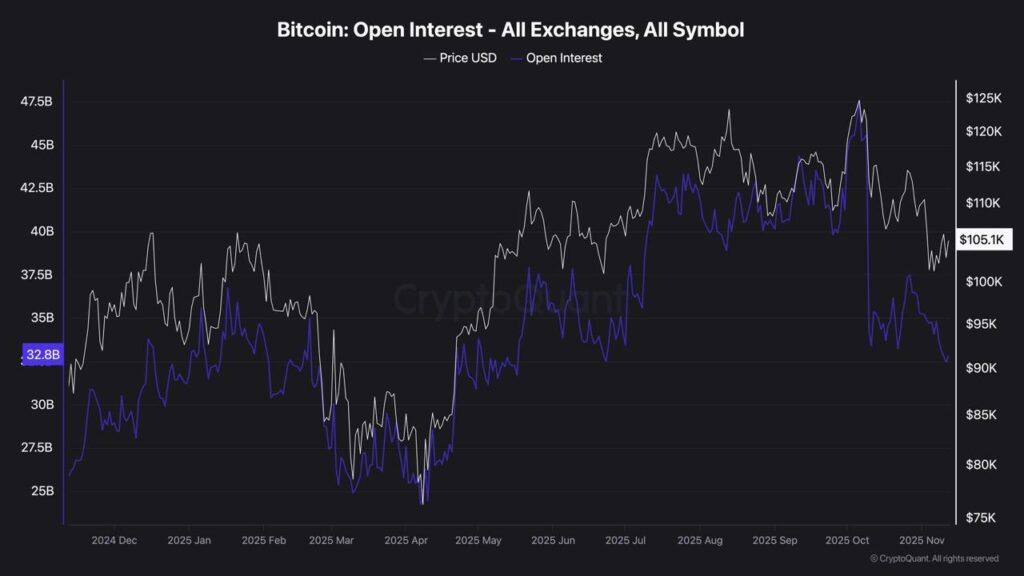 At the same time, one metric is flashing caution: Bitcoin open interest across exchanges has fallen to its lowest level in seven months, currently hovering around $32.1 billion, according to data retrieved by Finbold from analytical platform CryptoQuant on November 12.