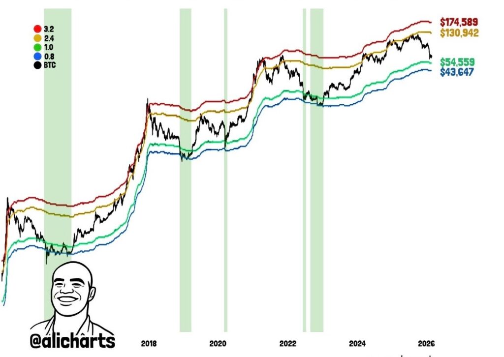However, BTC price is still trapped in a macro bear market akin to its 2022 fractal pattern, according to trading expert Ali Martinez. This analyst highlighted that the BTC price will likely find its bear market bottom between $54,559 and $43,647.