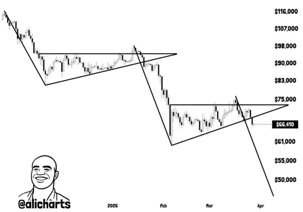 The renewed selling pressure has raised the odds of a capitulation event similar to Bitcoin’s sharp drawdown in February 2026, according to analysis trading expert Ali Martinez. Martinez also noted that BTC has been forming a descending triangle over the past two months – a classically bearish pattern characterized by a declining resistance line and a relatively flat support floor – which, combined with rising whale distributions, compounds the downside risk.