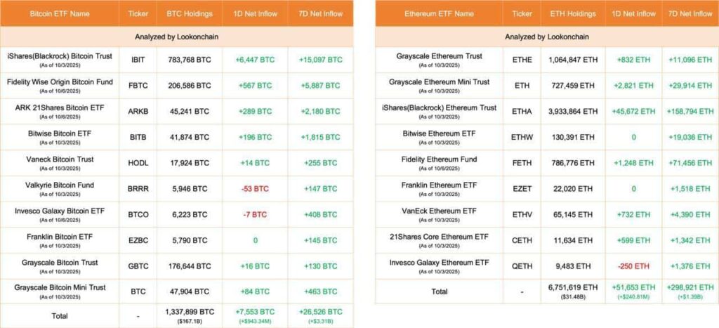 BlackRock continues to assert dominance over the cryptocurrency ETF landscape, with fresh data showing the asset manager deployed well over $1 billion into Bitcoin and Ethereum on October 6, 2025.