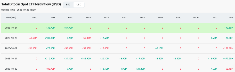 Momentum continued with $73.6 million added on October 22 and a further $107.8 million on October 23, reflecting renewed institutional accumulation. By October 24, inflows slowed to a more modest $32.7 million.