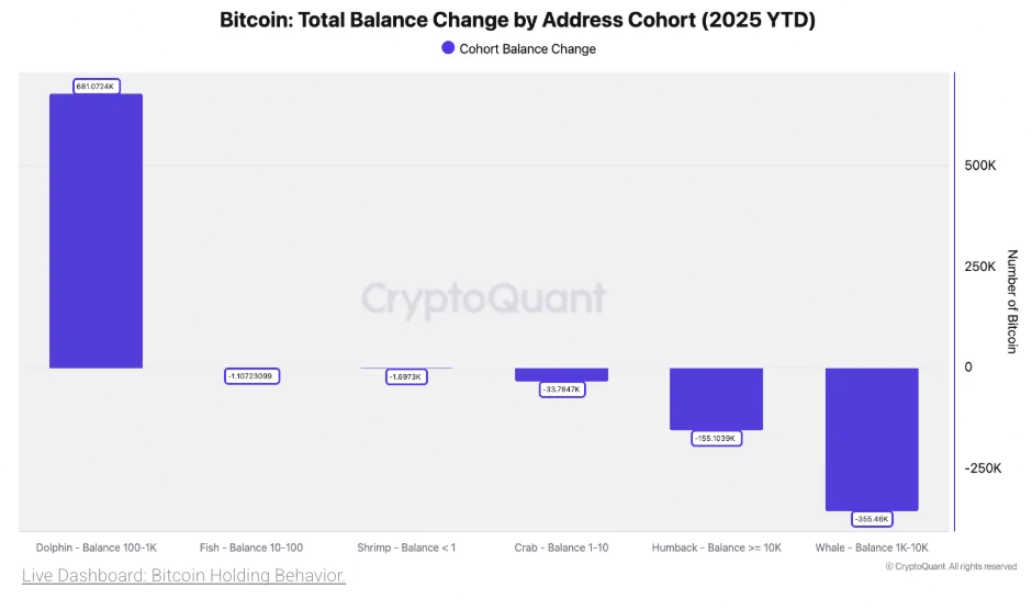 Meanwhile, CryptoQuant highlighted the “dolphin” cohort, wallets holding 100 to 1,000 BTC, as a key indicator of Bitcoin’s structural demand. This group now holds 26% of Bitcoin’s total supply, with a significant year-over-year increase of 681,000 BTC in 2025.