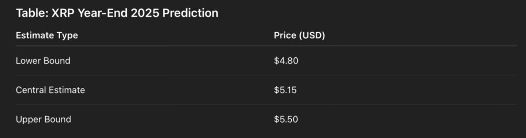 Pressed for a tighter forecast range, the chatbot predicted that XRP is most likely to close the year somewhere between $4.80 and $5.50.