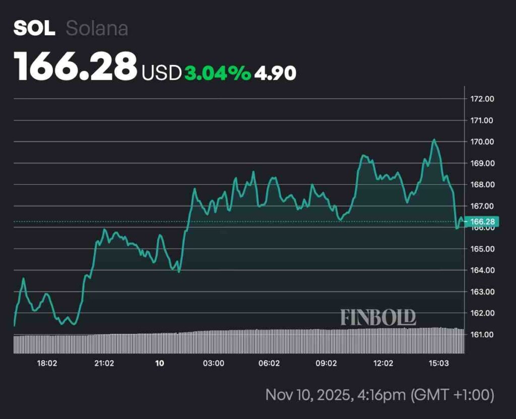 The third pick, Solana (SOL), is up 3% on the daily chart at the time of writing, trading at $166.28.