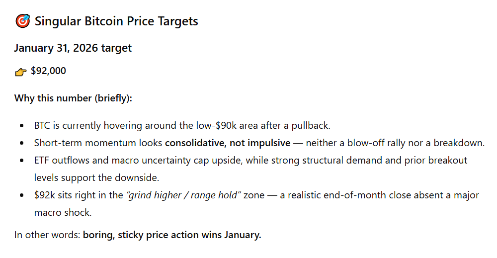 Despite the many potential catalysts, the AI model offered a highly conservative and slightly bullish price target for Bitcoin on January 31. Specifically, ChatGPT estimated that the cryptocurrency is likely to rise and trade at $92,000 at the end of the month.