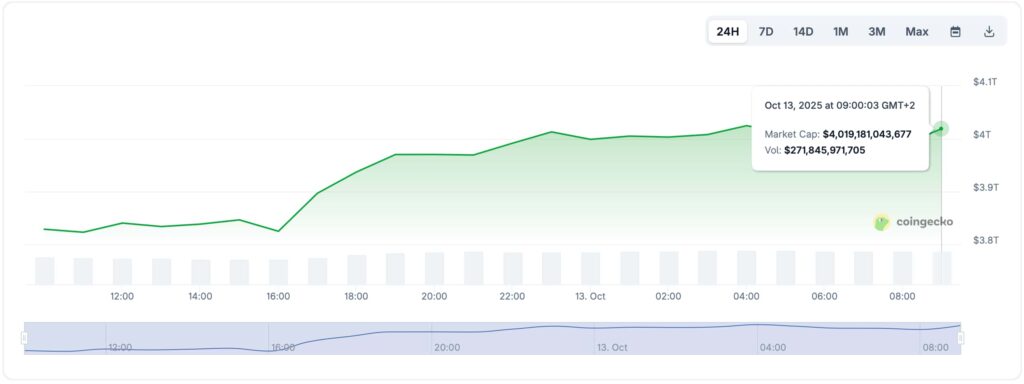 As of October 13 (GMT+2), total crypto assets stand near $4.019 trillion, up from $3.83 trillion the previous day, as per data retreived by Finbold from CoinMarketCap.