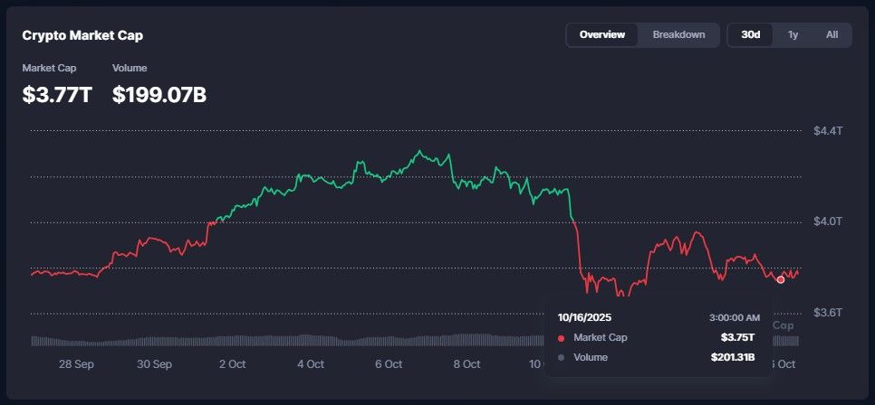 According to data retrieved by Finbold from CoinMarketCap, the global market capitalization dropped from $3.86 trillion on October 15 (12:00 p.m. UTC), to $3.75 trillion on October 16 (3:00 a.m. UTC).