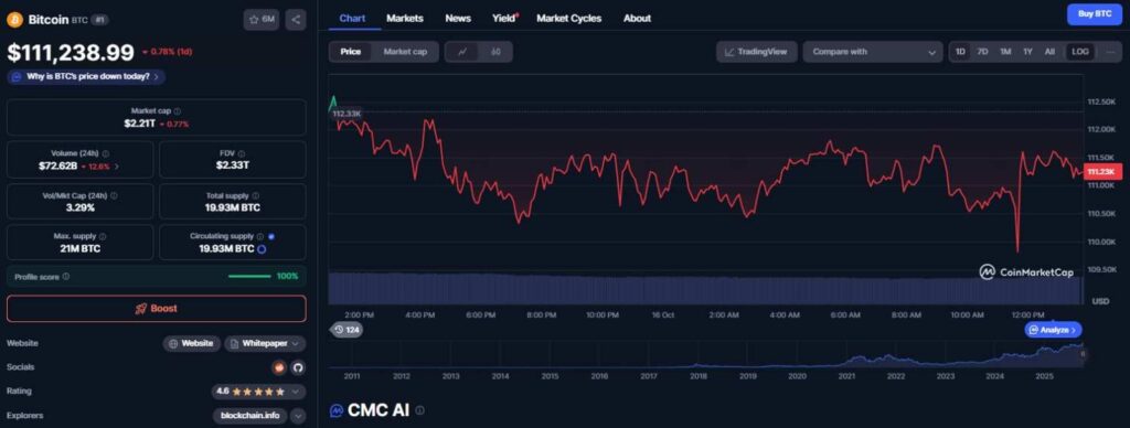 The “digital gold” has somewhat recovered since, trading at $111,238 at the time of writing, although it is still down 0.78% on the daily chart.