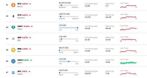Bitcoin, which often mirrors broader risk sentiment, plunged sharply. The maiden cryptocurrency is down 5.07%, trading around $86,709 and dragging its $1.7 trillion market cap lower.