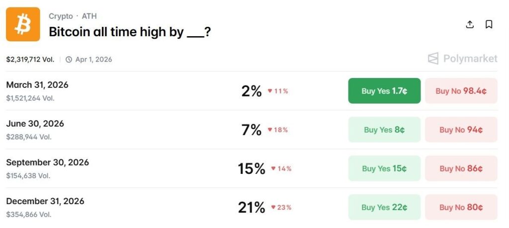 Specifically, while there is a trade with a volume of $2.3 million that is titled ‘Bitcoin all time high by ___?,’ with all the possible dates falling within 2026, the likelihood of it being resolved ‘yes’ with an actually new all-time high (ATH) is rather low.