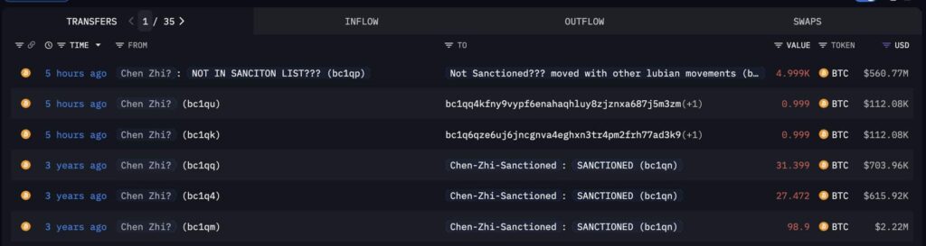 The most eye-catching detail, however, is not only in the past. Just hours ago, Arkham flagged a movement of 4,999 BTC, worth more than $560 million, from an address connected to Chen. What unsettled analysts is that this wallet was not yet on the official sanction list, echoing the flows associated with the infamous LuBian syndicate earlier this year.