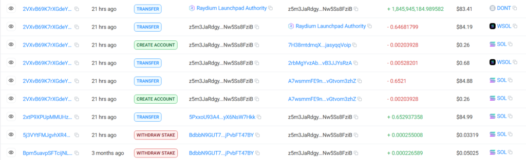 The initial DONT purchase for $83. Source: Solscan