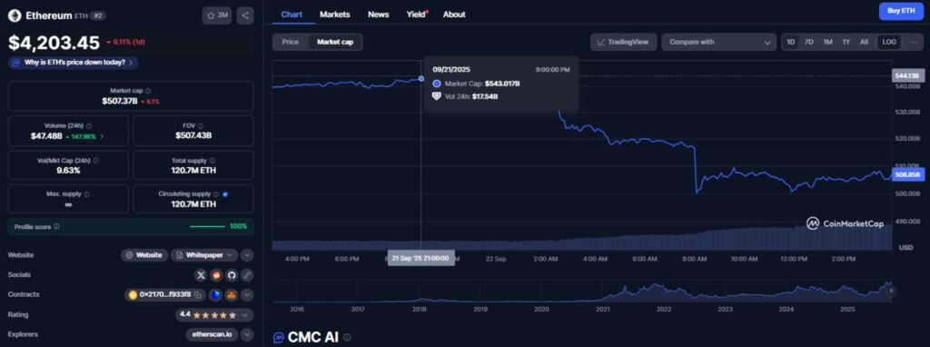 Ethereum (ETH) lost over $3 billion in market cap in less than 24 hours, dropping from just north of $543 billion on September 21 to around $506.85 billion on September 22.