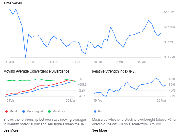 Bitcoin has also been trading within a tight range, consolidating between its 30-day Simple Moving Average (SMA) at $68,857 and the 7-day SMA at $72,130, with momentum indicators remaining neutral.