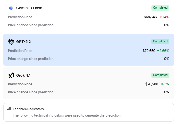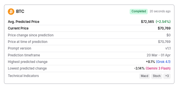 For example, Finbold’s AI prediction agent, which combines the outputs from Gemini 3 Flash, ChatGPT 5.2, and Grok 4.1, projects an average BTC price of $72,565 on April 1, 2026, suggesting a modest 2.54% upside from the current price of $70,769.