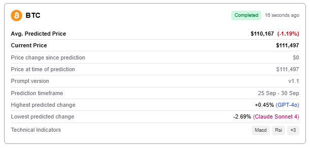 GPT-4o was the most bullish of the models used in the analysis, pointing to a price of $112,00 (+0.45%), while Claude Sonnet 4 and Grok 3 projected it would drop to $108,500 (-2.69%) and $110,001 (-1.34%), respectively.