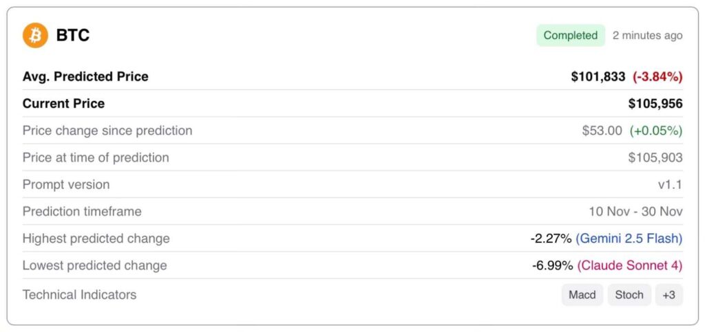 As further price swings are now expected, Finbold turned to its AI prediction agent to set the Bitcoin price by the end of the month. Surprisingly, the forecast suggests that the ongoing rally is going to be short-lived, as the average projected Bitcoin price for November 30 came in at $101,833, implying a 3.84% downside from the current price of $105,956.