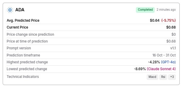Seeing how both Cardano and the overall crypto market are fighting to recuperate, Finbold consulted its AI price prediction machine learning tool to see how the story might develop and predict an average ADA price for October 31 by integrating three large language models (LLMs) with momentum-driven market technical indicators.