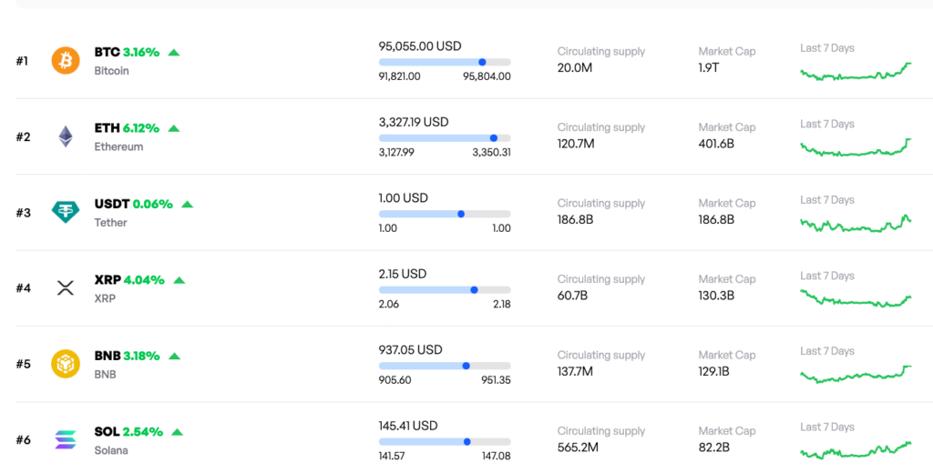 The rally was led by Bitcoin (BTC), which traded at $95,055 after ranging between $91,821 and $95,804 during the session. Bitcoin’s market capitalization rose to about $1.9 trillion, making it the largest contributor to the broader market move. Ethereum (ETH) followed with solid gains, trading at $3,327.