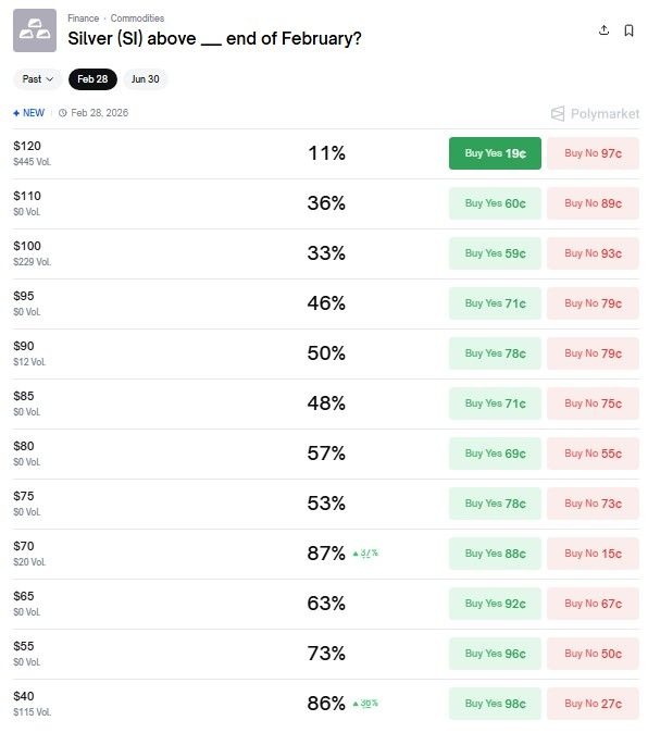Prediction market showing prices Silver is expected to be above in February. Source: Polymarket