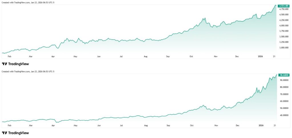 The author’s favored commodities have been reaching an all-time high (ATH) after an ATH at an accelerated pace in recent months. Gold is up 78.70% to $4,923 in the last 12 months, and silver has surged 225% to almost $99 within the same time frame.