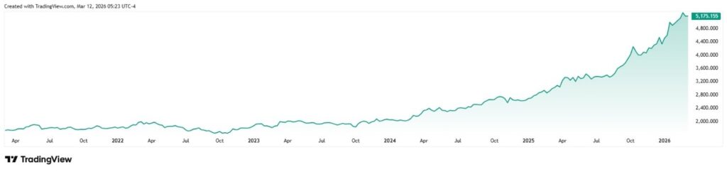 For example, though gold is below its highs above $5,400, investing in it just five years ago would have led to 200% returns thanks to the rise from $1,700 to nearly $5,200.