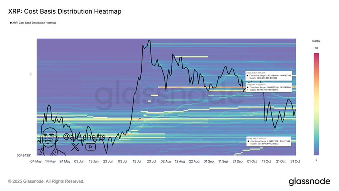 Meanwhile, on-chain data from Glassnode’s Cost Basis Distribution Heatmap shared by crypto analyst Ali Martinez on November 2 shows that XRP is currently consolidating below major resistance levels at $2.80 and $3.00, with significant supply clustering near those price points.