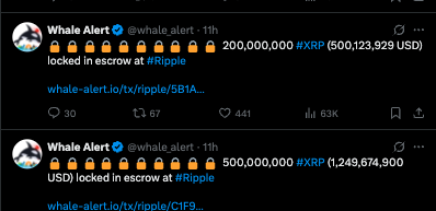 Shortly after the unlock, Ripple relocked 700 million XRP, worth about $1.75 billion, back into escrow through two separate transactions, one of 500 million XRP and another of 200 million XRP.