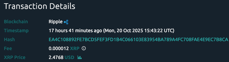 Blockchain data shows that Larsen transferred 50 million XRP, worth approximately $123.8 million, to an unknown wallet, according to Whale Alert’s insights on October 20.