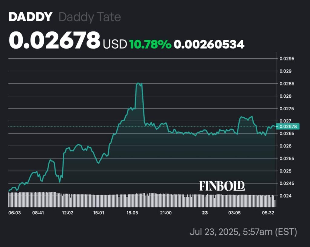 Daddy Tate (DADDY), the Solana-based meme coin tied to controversial internet personality Andrew Tate, has staged a sharp rebound after tumbling to a new all-time low earlier this month.