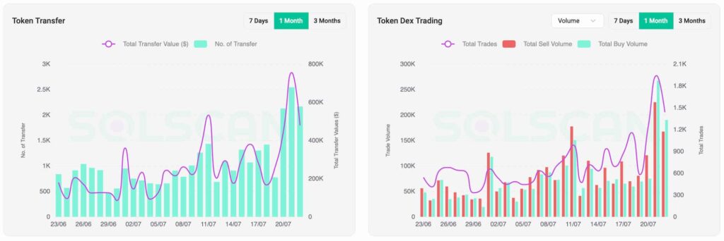 On-chain activity reinforces the picture of heightened speculative trading. According to SolScan, both token transfers and decentralized exchange volumes have surged to their highest levels in a month.
