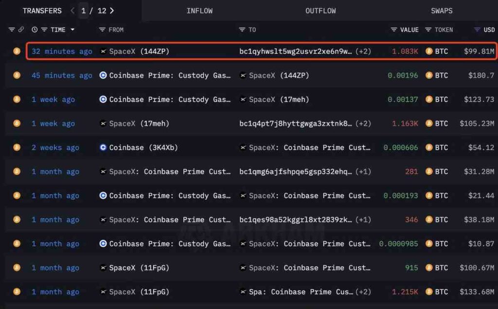 Data from Arkham confirms the withdrawal originated from one of SpaceX’s wallets and involved exactly 1.083K BTC. Several of the company’s previous transfers have been linked to Coinbase Prime custody services, and the latest activity is consistent with those patterns, although the precise destination has not yet been verified on-chain.