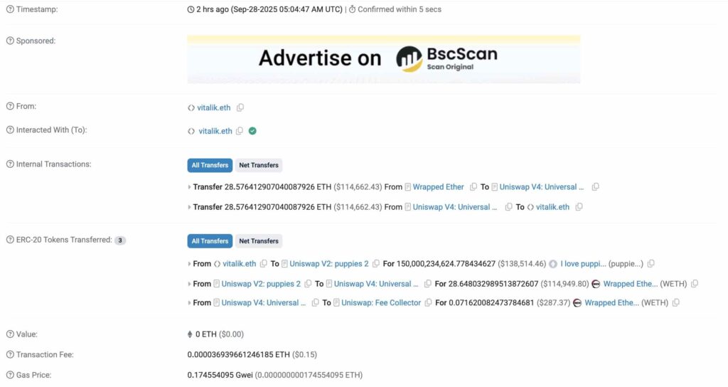 Blockchain data reviewed by Finbold from Etherscan shows that on September 28, Buterin’s wallet, vitalik.eth, sold 150 billion PUPPIES tokens for 28.58 ETH, worth approximately $114,700 at the time of the transaction.