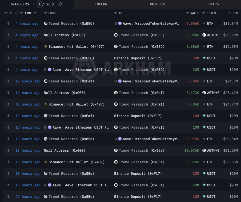 The accumulation pattern appears methodical. On-chain records indicate repeated movements between Aave, Binance, and Trend Research, linked wallets, suggesting leveraged positioning and strategic capital rotation rather than short-term speculation.