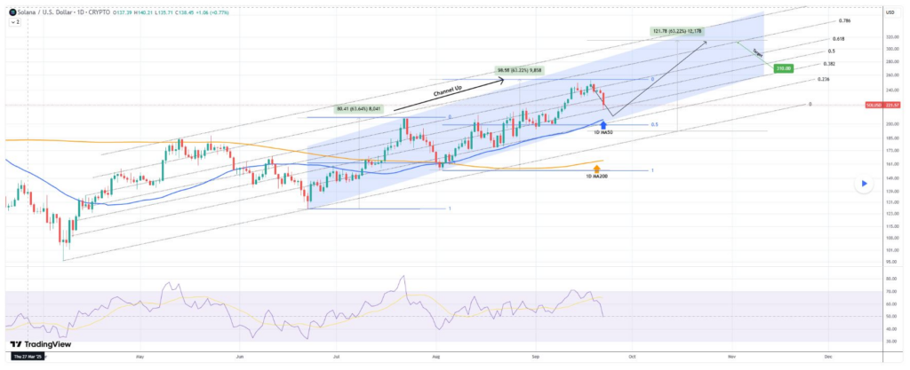 In a TradingView post on September 22, the analyst noted that after gaining more than 63% in its last bullish leg, SOL is now undergoing a pullback, mirroring a previous move where prices retraced to the 50-day moving average (MA) and the 0.5 Fibonacci retracement level before resuming their upward trajectory.