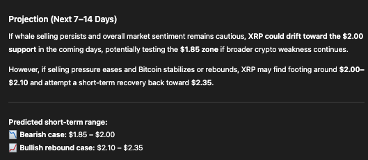 If current patterns persist, XRP could retest the $2 support level in the coming sessions. Conversely, if Bitcoin (BTC) stabilizes and broader market sentiment improves, the token may find a short-term floor between $2 and $2.10, paving the way for a modest rebound toward $2.35.