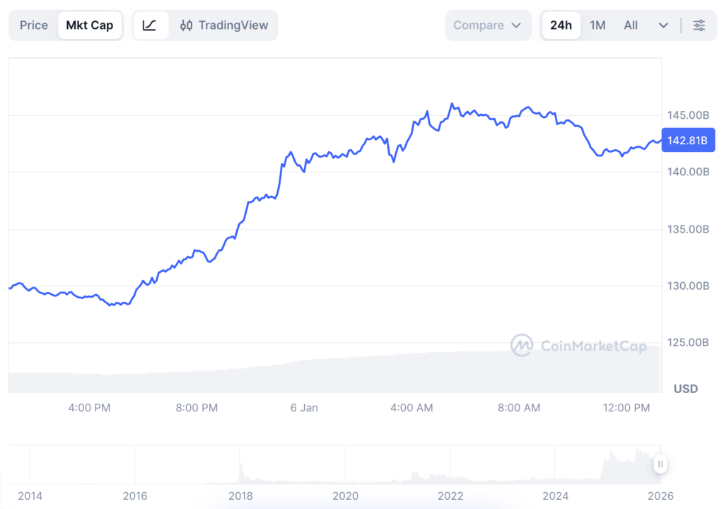 XRP’s price advance drove a sharp rise in market value, lifting its market capitalization to $142.81 billion at press time from $129.74 billion a day earlier, representing an inflow of $13.07 billion.