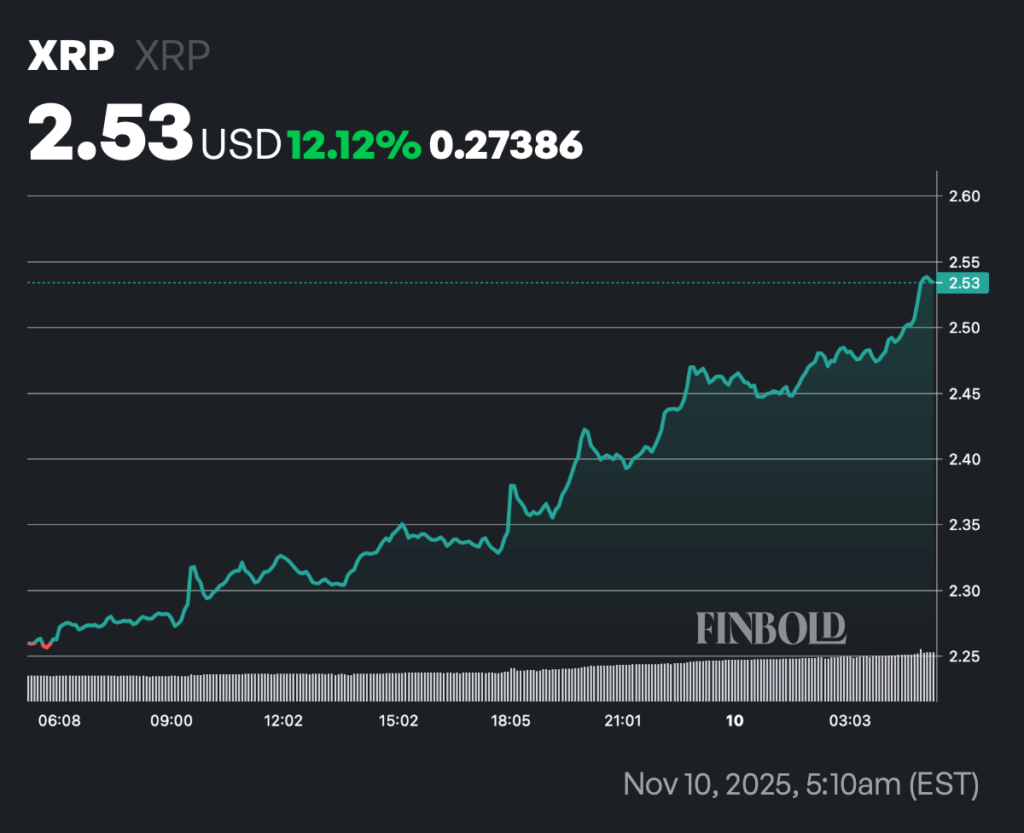 Trading volume also climbed to $4.98 billion, up 91% day-over-day. As a result, XRP significantly outperformed the broader cryptocurrency market, which gained 4.94% on the day.