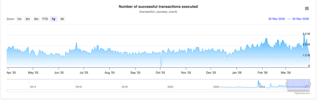 Transaction activity has also hit a notable milestone. Successful transactions reached 3.11 million on March 23, the first time the network has processed over 3 million in more than a year.