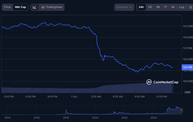By press time, XRP’s market capitalization stood at $123.15 billion, down from $134 billion a day earlier. The decline represents a staggering $10.85 billion wipeout, making the token the biggest loser among the top 10 digital assets by market cap.