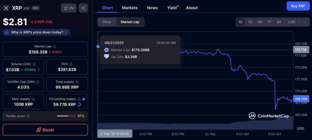 XRP shed more than $11 billion in market value overnight, slipping from a capitalization of $179.39 billion on September 21 to just $168.35 billion by September 22.