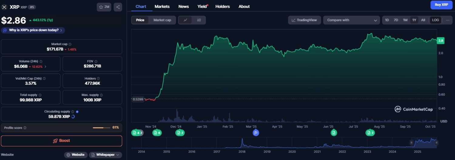 Lastly, at today’s price of $2.87, XRP’s market capitalization sits around $172 billion. To revisit its most recent all-time high of $3.65 on July 18, 2025 (CoinGecko data), the token would need to reach a market cap of roughly $218.5 billion.
