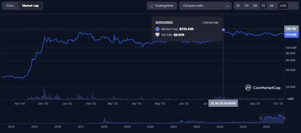 XRP hit its highest market capitalization, nearly $210.43 billion, on July 22, 2025. In the same month, its price had risen over 35% from its June levels, hovering around $3.55 as the asset reached its valuation peak, with about 59.27 billion tokens in circulation, as per CoinMarketCap data retrieved by Finbold.